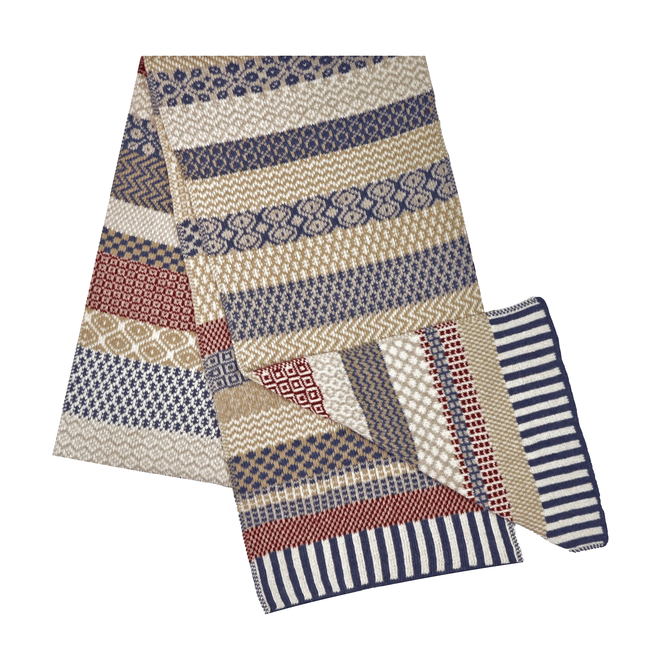 Colors in this scarf: Blue, White, Gold, Red and Cream.